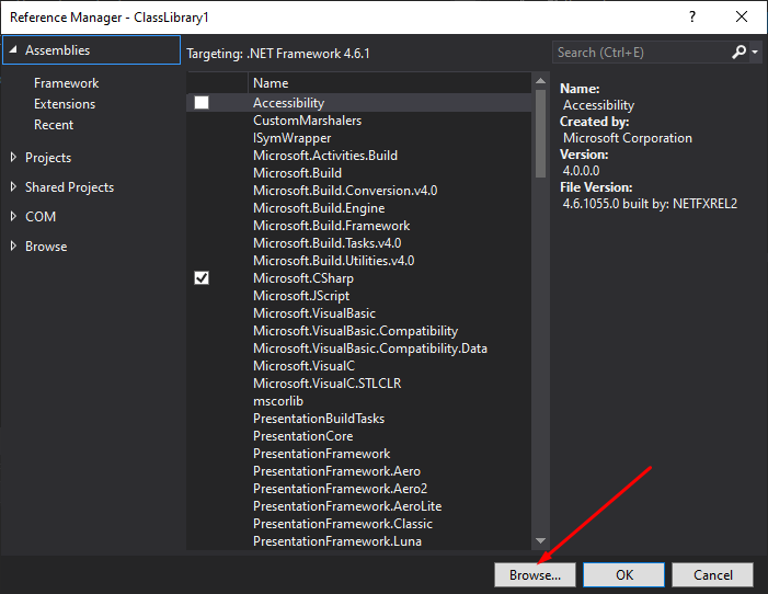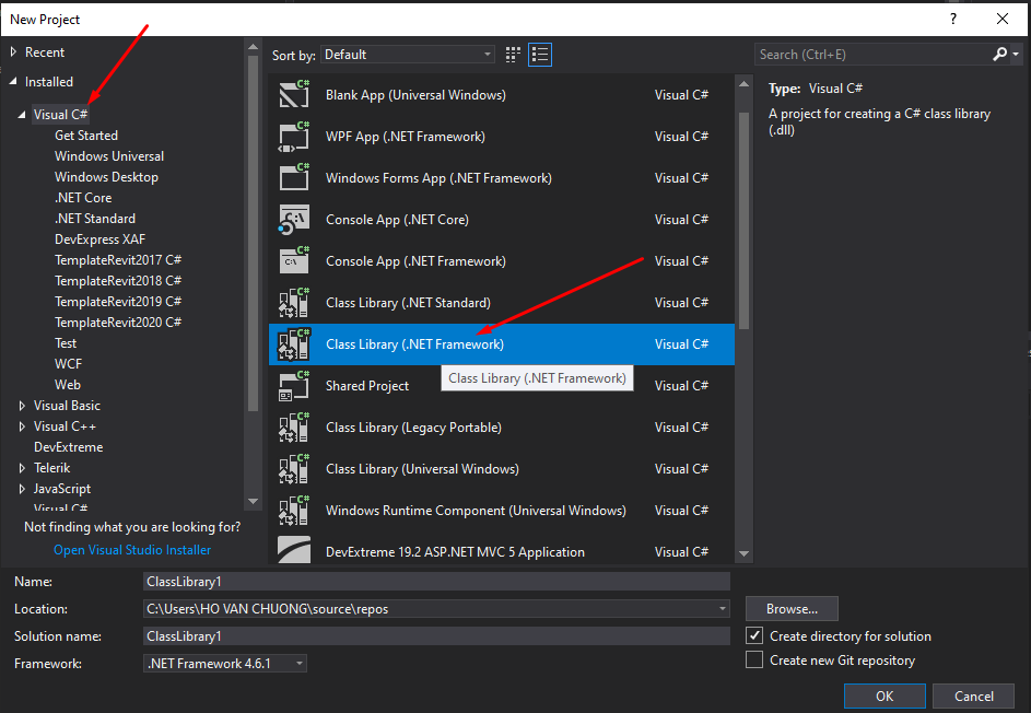 Đầu tiên các bác mở Visual Studio lên → File → New → Project → Class Library (.NET Framework) và chọn OK để khởi tạo dự án.