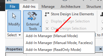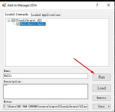 Đấy thế là can thiệp được vào Revit rồi nhé, nhưng không lẽ mỗi lần chạy mình lại sài cái công cụ đó sao.Tất nhiên là không rồi, đó chỉ là công cụ giúp mình kiểm tra code nhanh mà thôi, giờ thì mình làm thêm vài bước nữa để khỏi phụ thuộc vào cái kiểm thử Addin Manager kia luôn.