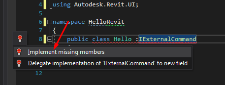 Giờ mình sẽ triển khai cái class đó kế thừa từ IExternalCommand.Các bác cứ hiểu đơn giản là để Revit nó nhận ra cái lớp mình đang khai báo thực thi một cái gì đó ví dụ thực thi giao diện người dùng trong Revit chẳng hạn, hiểu đơn giản hơn là đi massage cũng phải có tấm vé vào cổng vậy đó.
