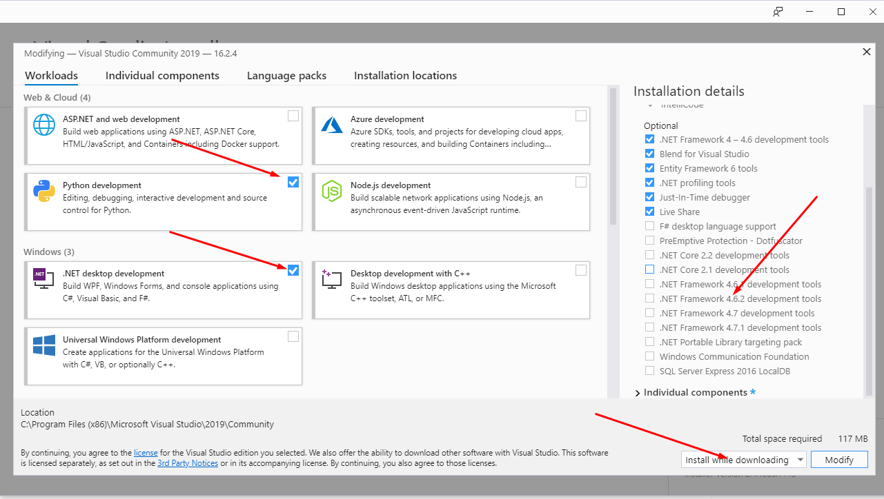 Sau khi tải về , mình mở lên và chọn như bên dưới hình nhé, lỡ sau này mình có code Python nữa thì lỡ rồi làm một lần luôn, đặc biệt là .NET Framework thì phải chú ý cài cho kĩ nhé các bác , không thì sau này có nhiều lỗi phát sinh lắm.