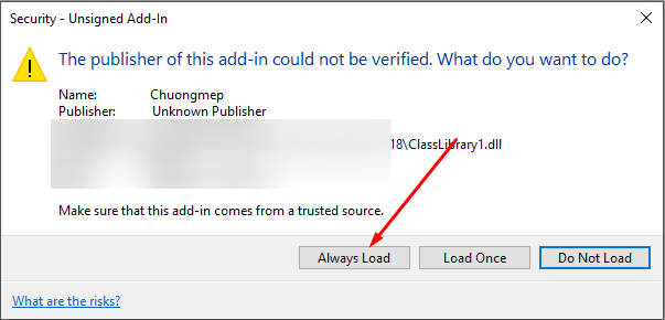 C:\Users\<Your User Name>\AppData\Roaming\Autodesk\Revit\Addins\202xSau khi chép xong mình sẽ khởi động lại Revit phát để nó nhận cái tệp dll kia và yêu cầu mình quyền ghi danh vào revit.Điều này cũng có thể vượt qua sau này nhưng không loại bỏ được bảng thông báo trừ khi bạn có đăng kí chứng chỉ nhận dạng phần mềm.