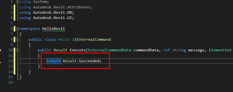 Khi chọn vào như trên mình sẽ thấy nó tự sinh ra môt phương thức Execute () có nghĩa là các bác đã thi hành những gì kế thừa từ IExternalCommand nó sẽ trả về các kết quả : Thành công, không thành công, hay hủy luôn hành động đã làm từ bên trong lớp kế thừa kia.Những hành động này chỉ là để trả về kết quả như vậy, giả sử mã của mình là ngon cơm thì mình sẽ trả về là Result.Succeeded; còn lỗi rồi thì trả về Result.Failed.