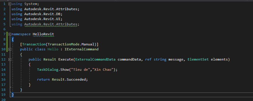 Như mọi ngôn ngữ lập trình thì luôn có câu chào cửa miệng là Hello Word nghe nhức cả nách, vậy thì mình thử khai báo cho nó để thực thi trong Revit thử xem thế nào.Lưu ý quan trọng ở đây là trên mỗi class cần khai báo thuộc tính bắt buộc của giao dịch thực hiện.Các giao dịch có 3 loại nhưng phổ biến nhất nên chọn Transaction.Manual để có thể được dùng một cách bình thường hóa nhất.