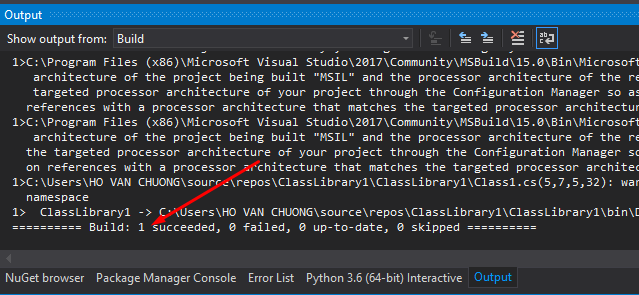 End ClassTrên thanh công cụ của Visual Studio, mình chọn vào Build và chọn Build Solution.Kết quả sau đây hiện lên tức là mình đã cài đặt thành công.