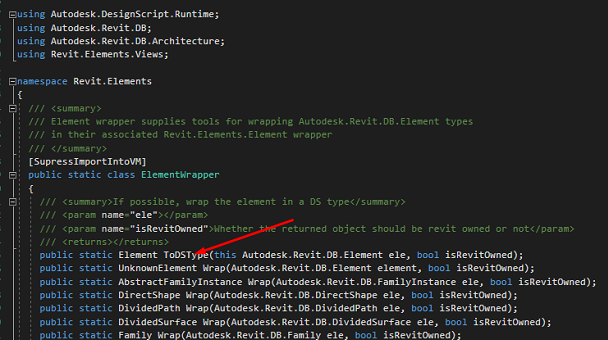 • ToDSType(bool) : Để thông báo rằng tui vừa lấy một đối tượng trong revit và quăng vào Dynamo đây.Nếu để True thì đồng ý còn ngược lại thì không . Hãy nhìn Class dưới đây để hình dung rõ hơn về ToDSType