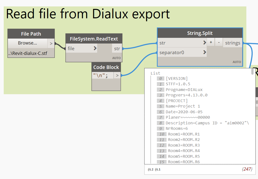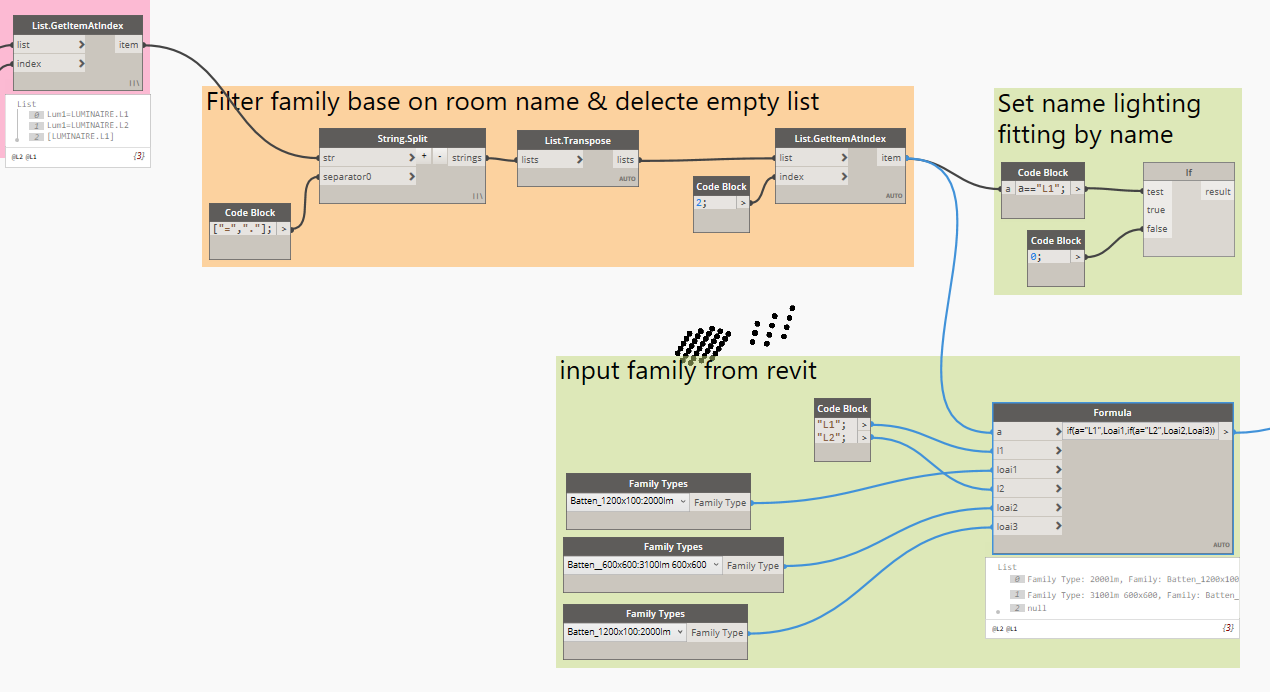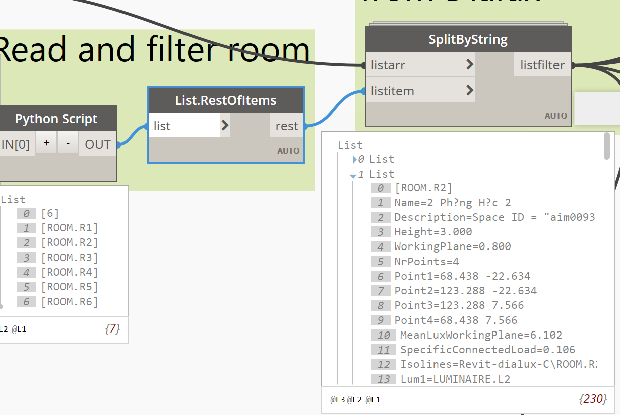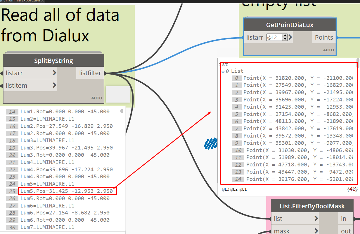 Công việc tiếp theo của mình là sẽ tái tạo lại các điểm lộn xộn trong đám list con này sang toạ độ điểm revit đã, với tiêu chí ban đầu là đơn vị mét từ phần mềm DIALux xuất qua tương tự như lọc cái room kia nhưng lần này hơi khác một xíu.