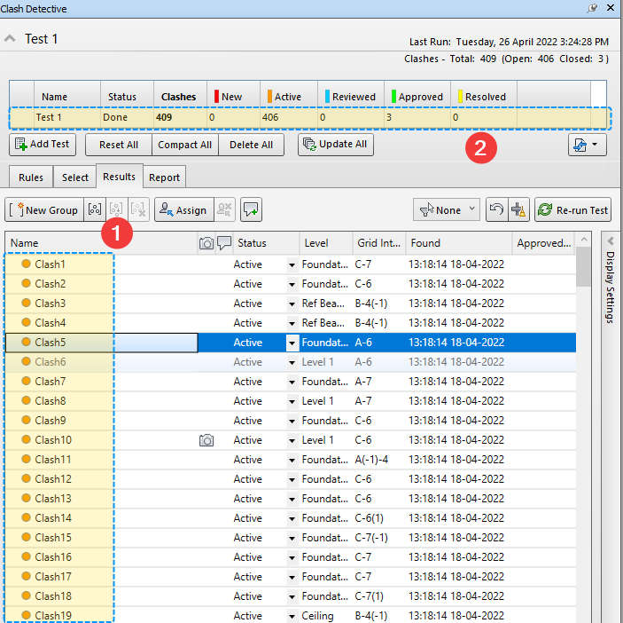 2.Clash(Clash Test) Test cho người dùng tạo ra để kiểm tra xung đột, bao gồm hiển thị số lượng Clash Result, Status,Resolved, ...