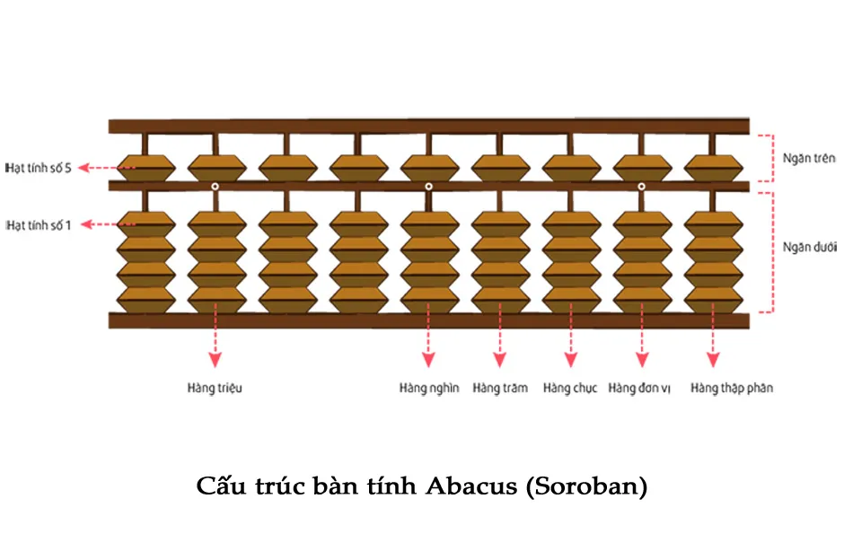 Bàn tính Soroban của người Trung Quốc có cấu tạo phía trên thanh ngang có một hạt quy ước với giá trị là 5. Phía dưới thanh ngang gồm 4 hạt, quy ước mỗi hạt có giá trị là 1. Mình vẫn đang học hỏi về cách sử dụng thành thạo bàn tính Soroban này.