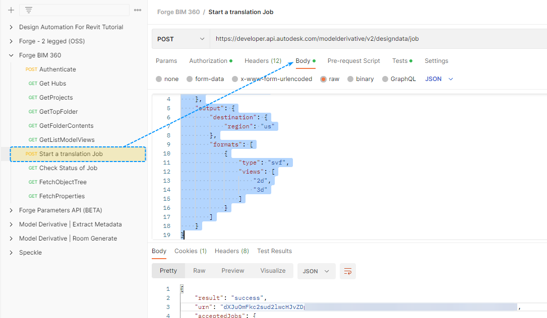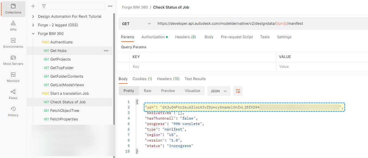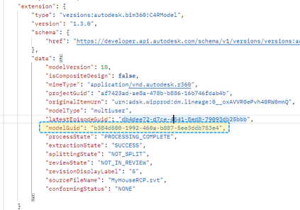 Đối với công việc tiếp theo của bạn, để đặt chân đến được siêu dữ liệu bao gồm đối tượng (object) và các thông tin (parameter) thuộc tính cỉa đối tượng (object), bạn cần phải lấy về được urn của mô hình. Hãy xem xét các đoạn json trả về và bạn sẽ thấy một đoạn tại derivative có chứa thông tin urn của mô hình.