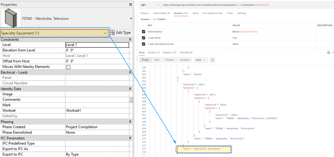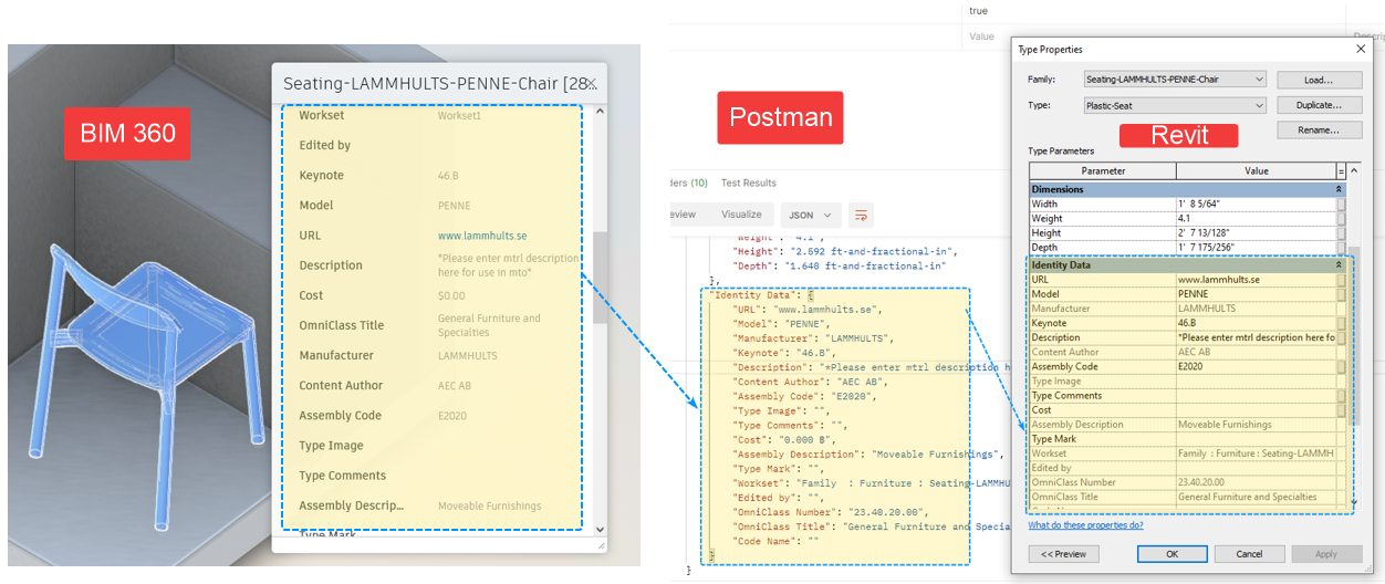 Và điều cuối cùng hơn hết chính là các tham số của đối tượng đó. Điều này sẽ giúp bạn có thể xem xét và đối chiếu với các thông tin của đối tượng trong BIM 360. Hãy sử dụng API https://aps.autodesk.com/en/docs/acc/v1/overview/field-guide/model-properties/ để lấy về toàn bộ thông tin thuộc tính của đối tượng có trong dự án, mẫu bên dưới cho phép bạn so sánh giữa Forge, Postman và BIM 360, cả ba đều cho kết quả giống nhau với đối tượng là chiếc ghế mình đang ngồi làm việc.