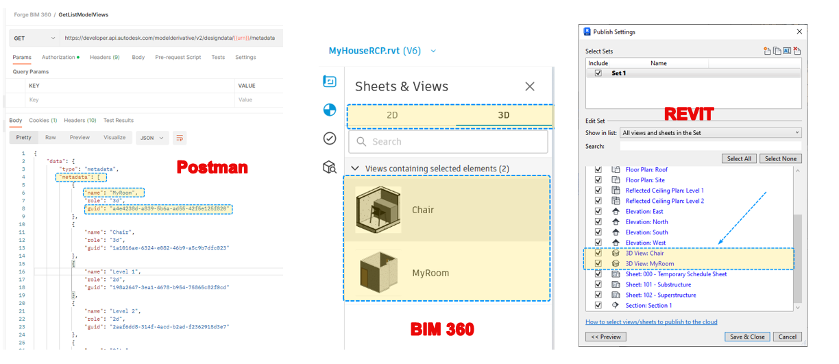 Bạn sử dụng API https://forge.autodesk.com/en/docs/model-derivative/v2/reference/http/metadata/urn-metadata-GET/ để xem xét và đối chiếu. Lưu ý rằng guid bạn cần lấy ra để sử dụng cho công việc lấy về thông tin đối tượng (object) hoặc thông tin tham số của mô hình (parameter). Tùy thuộc vào mỗi View (2D & 3D) bạn sẽ thấy có mỗi guid riêng biệt, và việc lấy thông tin đối tượng và tham số sẽ ảnh hưởng vào chính guid mà bạn sẽ truyền vào. Rất nhiều người đã nhầm lẫn guid này với model guid hoặc project guid nhưng đó là sai lầm không đáng có.