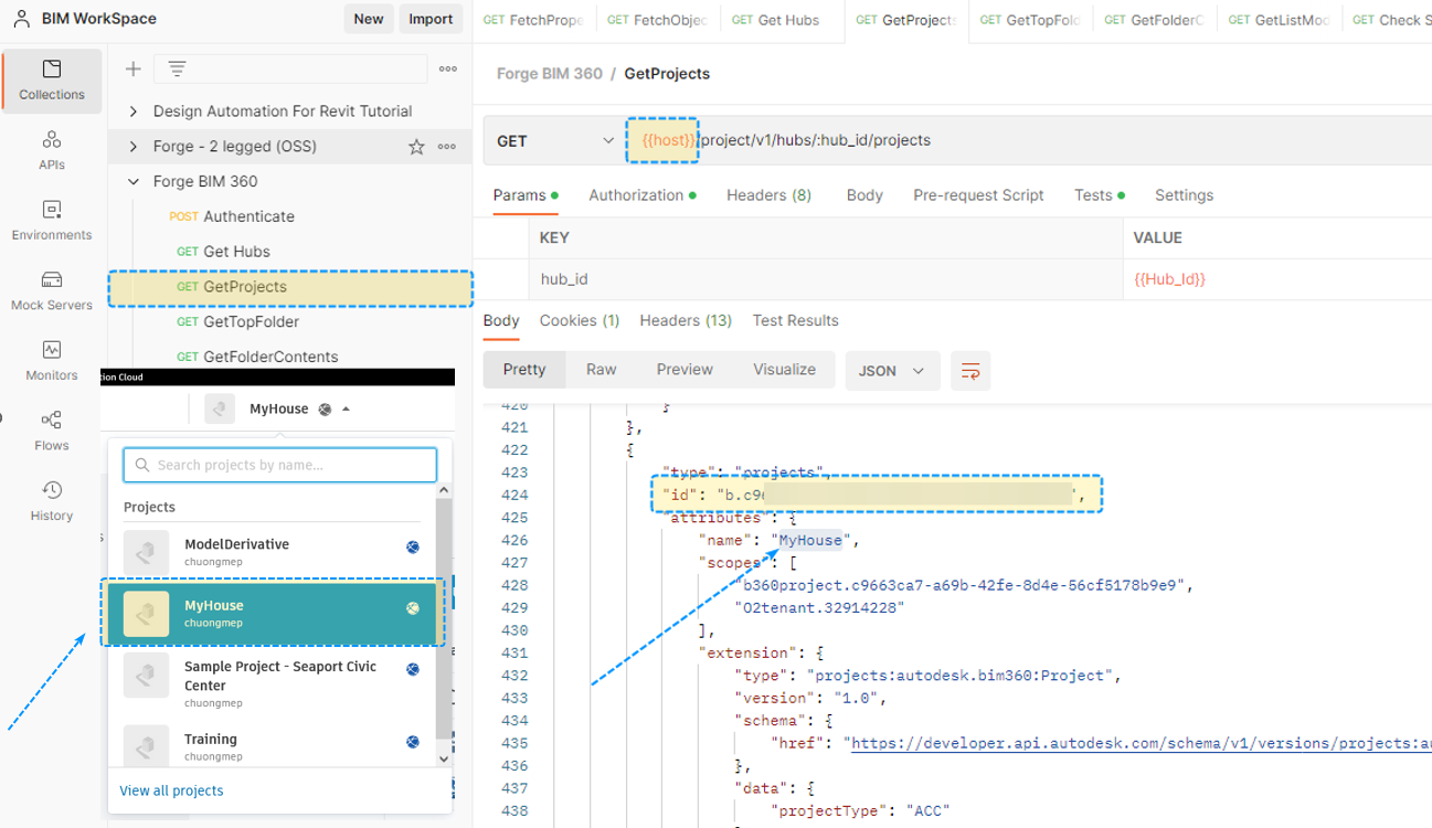 }Với Hub_Id đã có bên trên, việc lấy về tất cả các dự án sẽ sử dụng thông qua API https://aps.autodesk.com/en/docs/data/v2/reference/http/hubs-hub_id-projects-GET/.