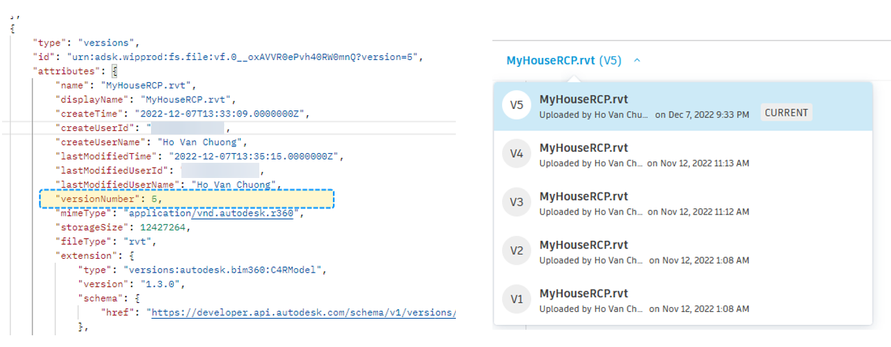 Đối với phiên bản, bạn cũng thể sử dụng API get https://aps.autodesk.com/en/docs/data/v2/reference/http/projects-project_id-items-item_id-versions-GET để xem xét kỹ lưỡng và đối chiếu với phiên bản hiện có.
