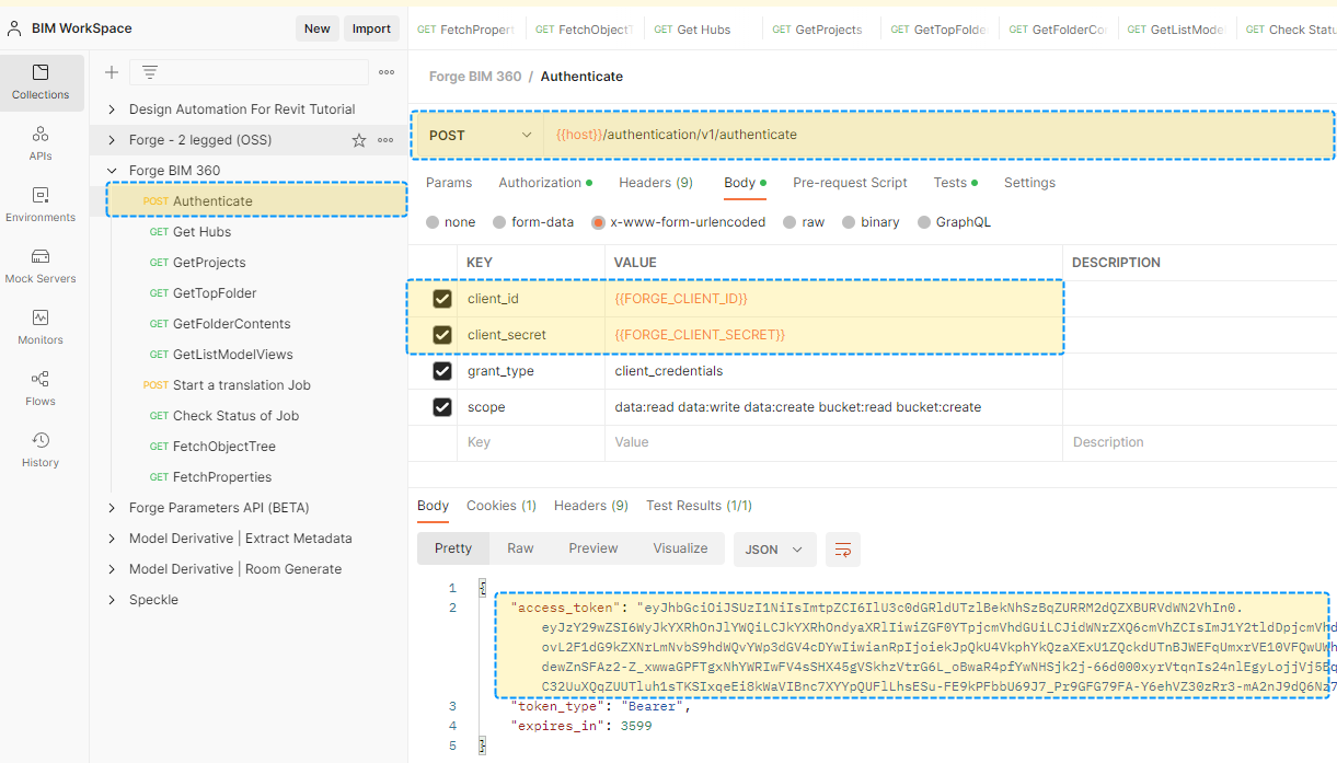 Tiếp theo bạn xác thực thông qua API https://developer.api.autodesk.com/authentication/v1/authenticate. Các tham số đầu vào được liệt kê tại https://aps.autodesk.com/en/docs/oauth/v2/reference/http/authorize-GET/. Đó là bước khởi đầu để bạn có được một token để sử dụng các API khác của Forge. Bạn có thể xem qua một Post API trả về một ascess_token như sau :