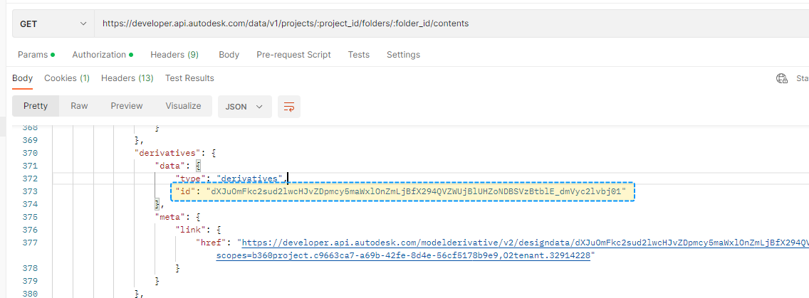 postman.setEnvironmentVariable("Project_Id",data[1].id);Get Folder Contents là API sẽ cho phép bạn xem chính xác các thư mục bên trong hoặc dự án bên trong thư mục thông qua ProjectId và FolderId của thư mục bạn cần gọi. Ở đây bạn dễ dàng thấy được các thông tin dữ liệu của dự án, với Model Guid là trọng tâm, phiên bản sửa đổi,... Sử dụng API https://aps.autodesk.com/en/docs/data/v2/reference/http/projects-project_id-folders-folder_id-contents-GET/