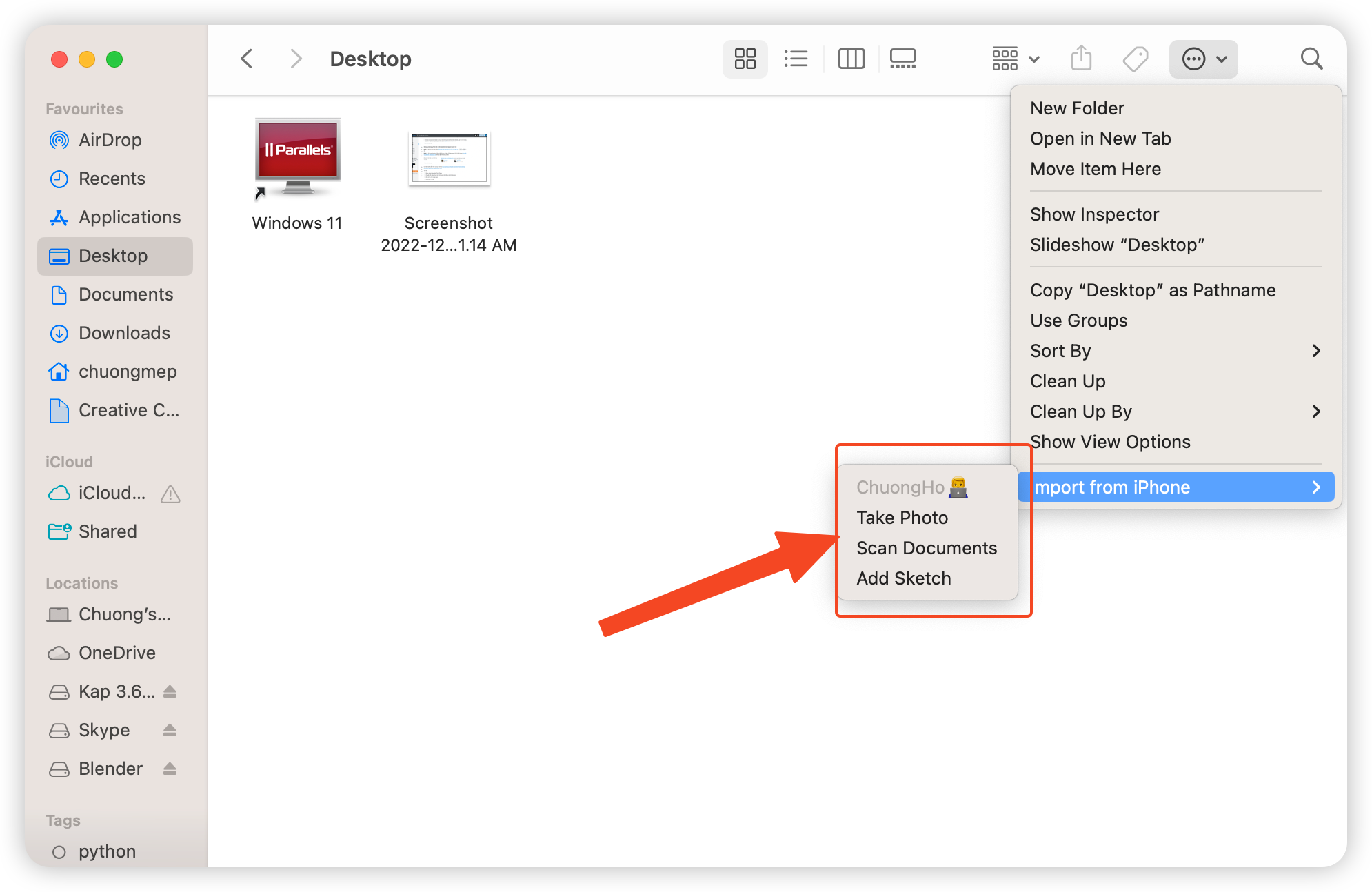 Hãy xem bức hình bên dưới, việc lấy một bức ảnh từ điện thoại chụp nhanh nó dễ dàng đến mức nào, phải nói là nó tức thời và quá tuyệt vời, bạn chỉ cần chọn vào tính năng, Iphone tự động mở Camera sẵn chụp từ điện thoại và ảnh sẽ đi đến thư mục bạn đang cần làm việc hoặc nhập ngay lập tức khi bạn nhấn đồng ý từ phía điện thoại. Điều mà MacOS đã vượt xa Windows rất nhiều.