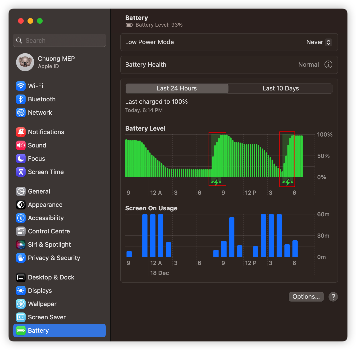 Pin là yếu tố đầu tiên khiến mình việc lựa chọn một chiếc máy tính, mình đã chán ngấy với các máy tính laptop Windows với thường lượng pin tệ đến mức suốt thập kỷ hay những cấu hình mạnh thì lại đi với một trọng lượng khá to lớn. Đối với các máy MacBook, mình có một thời lượng pin dài hơn trông thấy, mình có thể thoải mái mang laptop ra ngoài cafe mà không phải quá lo lắng về việc pin sẽ hết trong thời gian ngắn. Đây là một điểm rất quan trọng khi mình phải di chuyển quá nhiều. Hãy xem thời gian mình dùng hỗn hợp bên dưới, sạc thật sự nhanh và thời gian đủ để đáp ứng trong làm việc hiệu suất cao từ trưa đến 6h tối.