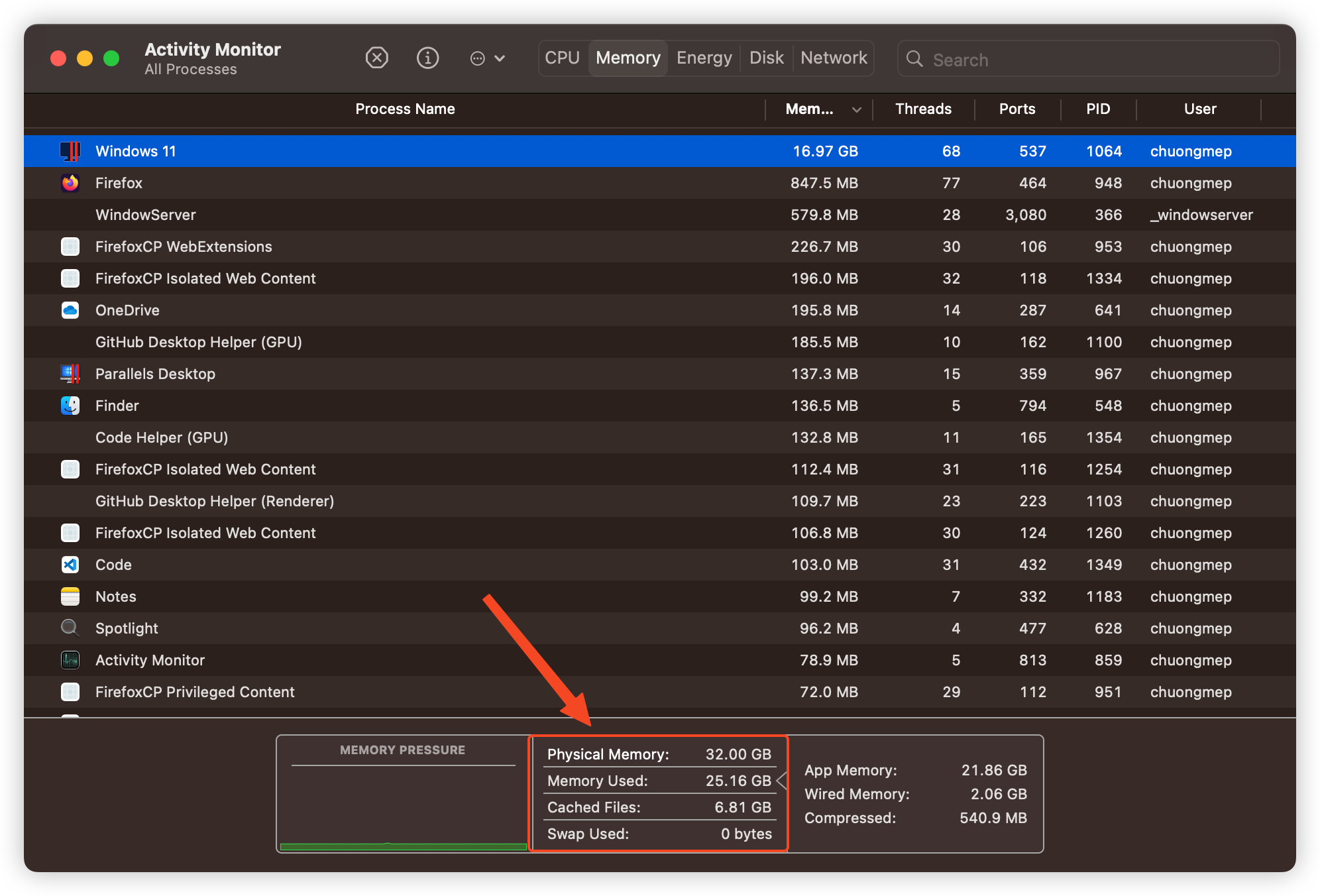 Và rõ ràng nếu bạn muốn mua một chiếc máy có thể đa năng như thế này thì Ram tối thiểu 32GB là có khả năng, vì vậy khoảng ram từ dưới 32 chắc chắn sẽ có vấn đề với bộ nhớ. Ở đây mình thử mở Rider, Visual Studio, Parallel, Visual Studio Code , Firefox, Revit, ... kết hợp như một lần làm việc thông thường thì bộ nhớ tiêu thụ như bên dưới. Trông ổn khi chia máy ảo là 16GB và Macos là 16GB.