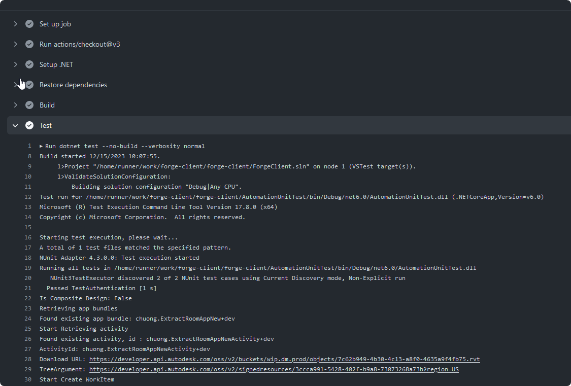 The returned test results will be displayed as follows, depending on your Console.WriteLine adjustments. Below is an example of a test executed on the Ubuntu platform through GitHub Action with the RevitDesignAutomateRoomTest method: