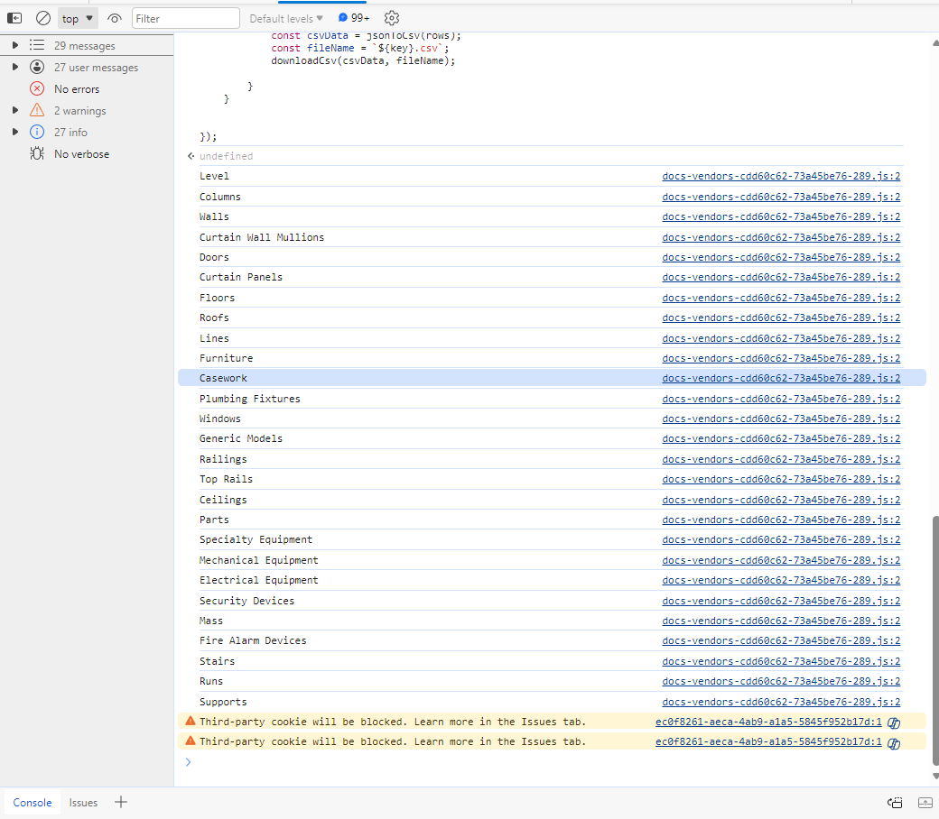 Consoleand pressEnter. In case of security concerns, you may need to grant browser access to perform these actions. - Once completed, you'll receive a CSV file containing data from the Revit model.