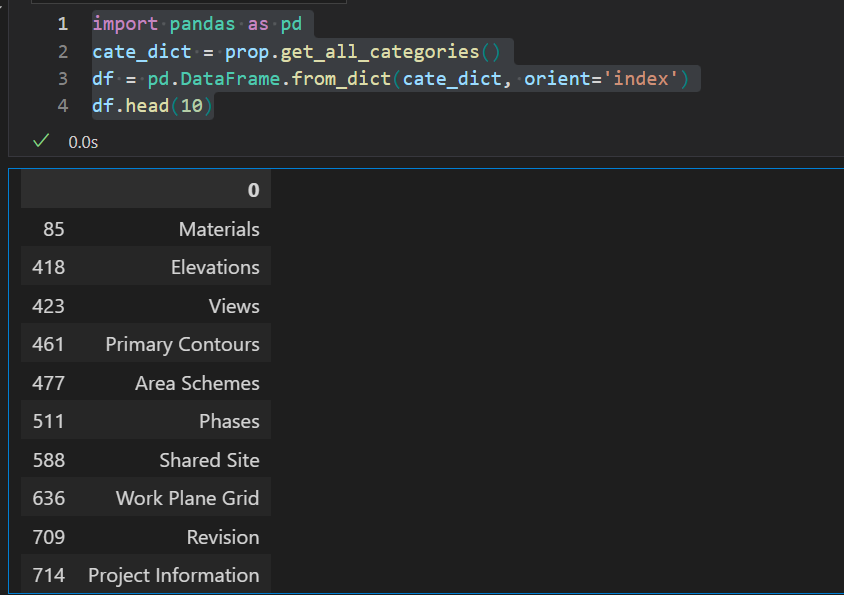 print(key, categories[key])- Extract data by categories and parameters from Revit file:
